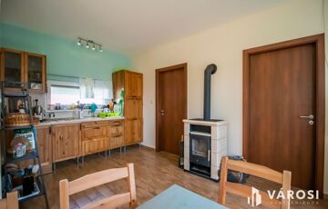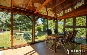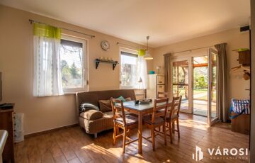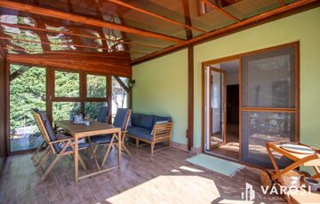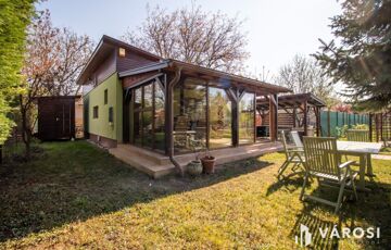 Az 577 négyzetméteres telken épült, 62 négyzetméteres tégla falazatú házban amerikai konyhás nappali étkezővel, 2 szoba és fürdőszoba található. A ház előtti terasz be lett építve, 3 rétegű üvegezéssel ellátott oldalfalakkal és hatalmas tolóajtóval. Ezeket kinyitva, közvetlen kapcsolat nyílik a csodás kerthez. Akár mind a 4 évszakban használható! Az életteret növeli a ház mellé épített szabadtéri konyha is. A ház igény szerint a teljes berendezéssel együtt eladó. A ház mellett további kettő kis tároló került megépítésre, a kerti eszközök tárolására.