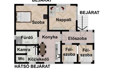 a, 114nm-es családi ház(különálló wc, kamra, konyha, fürdőszoba, 2 félszoba, szoba és egy nappali)