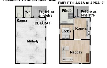 A műhely oldaláról, egy csigalépcsőn keresztül közelíthető meg a 40nm-es emeleti lakás(szoba, konyha, fürdőszoba és egy nappali) A közelmúltban teljes métékben fel lett újítva, klíma kiépítésre került. Fűtését és a meleg vizet is újszerű gázcirkó biztosítja.