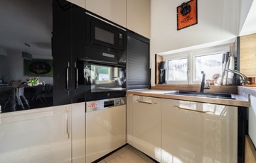 A földszinten modern, letisztult, prémium gépekkel felszerelt konyha, világos étkező és a két irányba – az első és hátsó teraszra – is nyíló nappali kapott helyet.