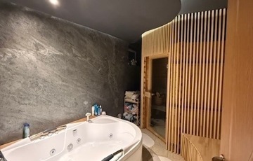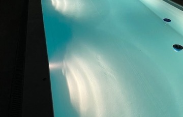 A hátsó teraszról nyíló kertben 8 × 4 méteres, gazdaságosan fűthető, nyakzuhanyos medence várja új tulajdonosát – tavasztól késő őszig használható, a köré épített faburkolatú napozóterasszal együtt valódi nyaralóélményt ad.