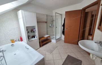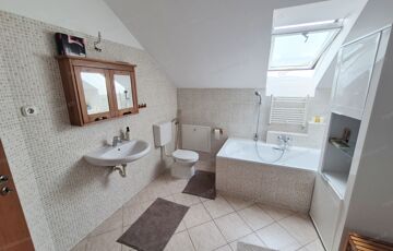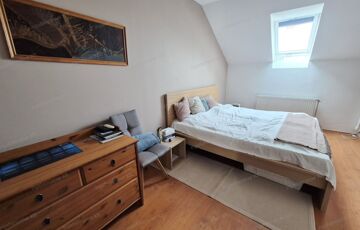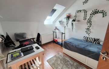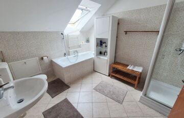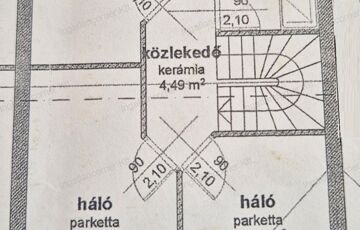 FELSŐ SZINT: Kényelmesen lépcsőfokokon keresztül jutunk az emeletre, ahol egy (4,49m2-es) közlekedőből nyílik: három jó méretű hálószoba (nettó: 12,32m2,12,12m2 és egy 10,06m2) majd egy ablakos káddal és zuhanyzóval felszerelt tágas (nettó: 6,74m2-es) fürdőszoba érhető el.