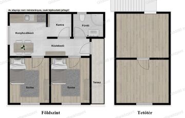 A földszint kb. 34 nm-es, praktikus elosztású: konyha, kamra, két félszoba, fürdő-WC és közlekedő került kialakításra, ill. egy 6nm fedett terasz is tartozik hozzá. Tetőtere emelt szintű készültségű.