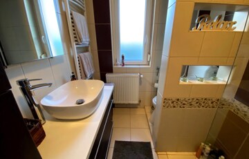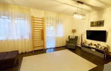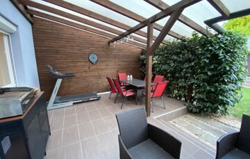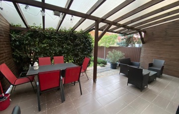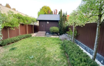 Az ingatlanhoz egy 100 m²-es, parkosított, pihenőkert tartozik melléképülettel, automata öntözőrendszerrel és elektromos garázskapuval. A 25 m²-es fedett terasz ideális helyszín a kikapcsolódásra és a családi, baráti összejövetelekre.