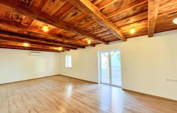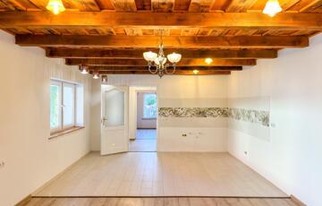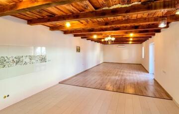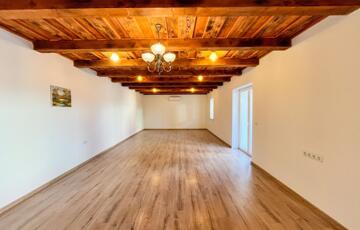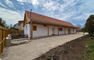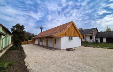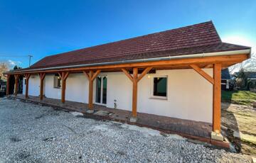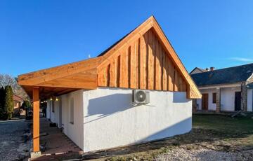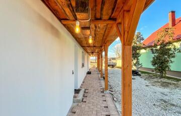 Stílus és hangulat: Egyedi belsőépítészet, látványos fagerendás mennyezet és egy 28 nm-es hangulatos tornác adja meg az ingatlan rusztikus, mégis modern karakterét.