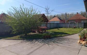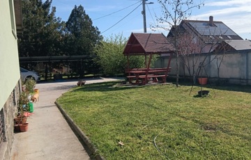 Az udvar egy része térkövezve van, a másik része parkosított, itt található egy szaletli is.