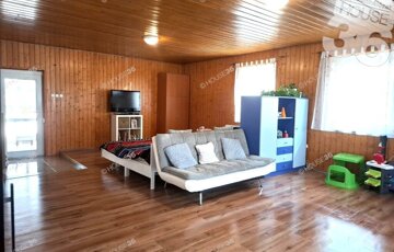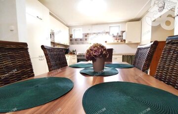 Különlegessége a közel 50 m2-es lambériázott nappali, amiből nyílik a kertre néző hátsó fedett terasz.